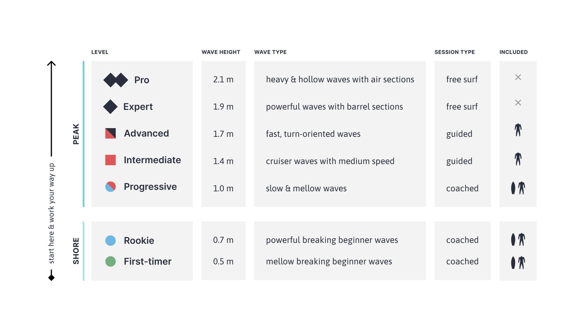 Seven surf levels from beginner to pro